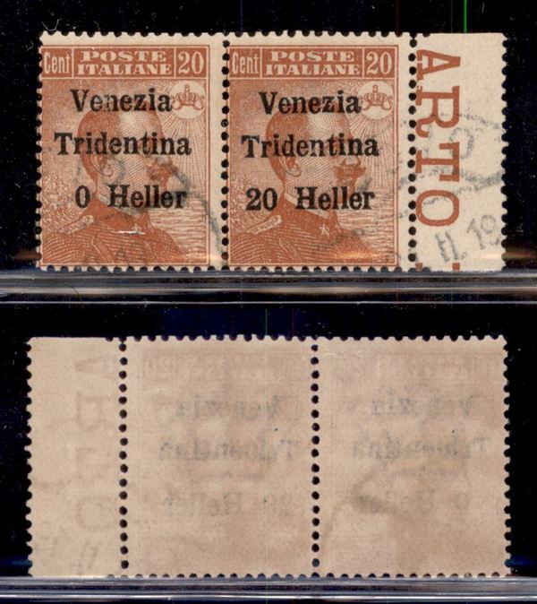 1918 - 20 heller su 20 cent (30c + 30) - coppia usata bordo foglio senza 2 a sinistra (157+)