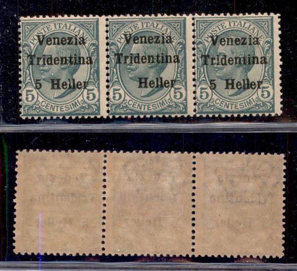 1918 - 5 heller su 5 cent Leoni (28+28d+28) - striscia orizzontale di 3 - pezzo centrale senza 5 - gomma originale e integra