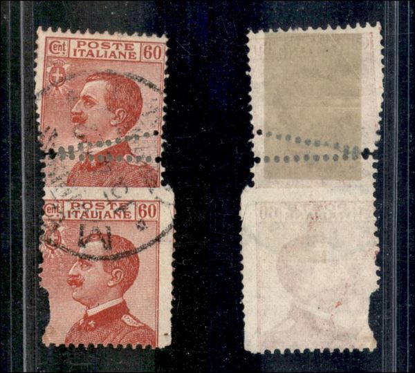 1918 - 60 cent Michetti (111) - coppia verticale ricongiunta - dentellatura centrale anomala per piega del foglio - pezzo inferiore difettoso - usata
