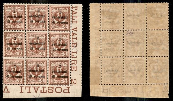 1919 - 2 cent su 2 (2) - blocco angolare di 9 con errore ORONA (2g) al centro + di con i in alto (2p) in basso al centro - gomma integra (250+)