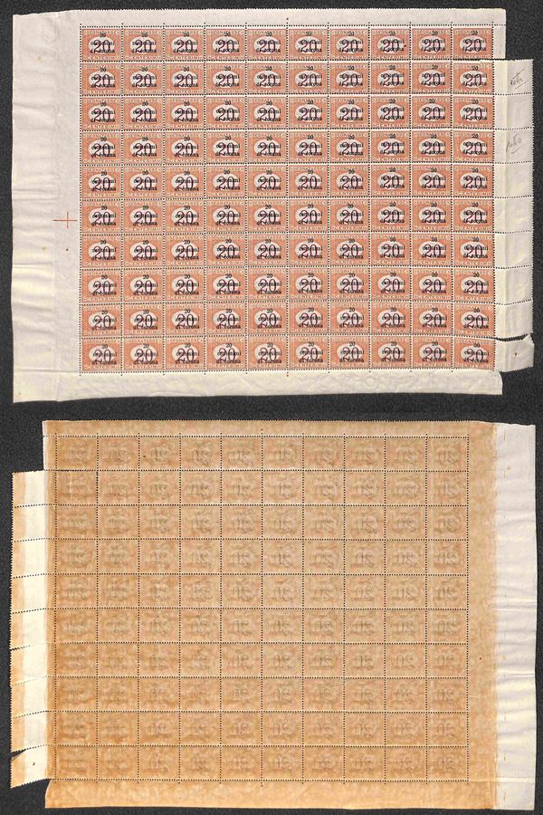 1919 - 20 cent su 20 (3) - intero foglio di 100 - gomma integra - centratura da discreta a ottima - due (pos. 20 + 40) strappati (5.500+)
