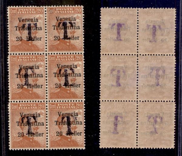 1919 - T su 20 heller su 20 cent (7) - soprastampa viola - blocco di 6 - gomma integra