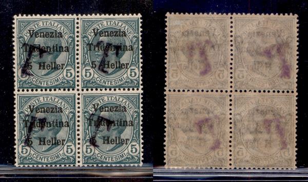 1919 - T su 5 heller su 5 cent (5ad) - quartina con soprastampe oblique - gomma originale (2 gomma integra)