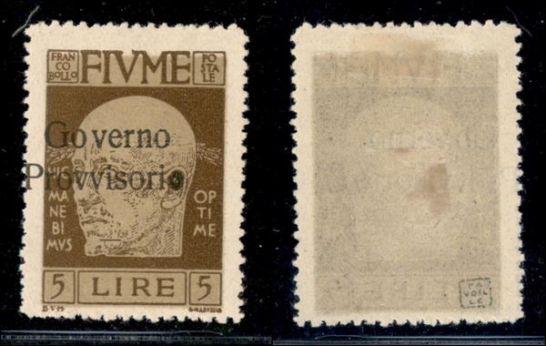 1921 - 5 lire D'Annunzio (162 ob) - soprastampa a sinistra + o chiusa - gomma originale (500+)