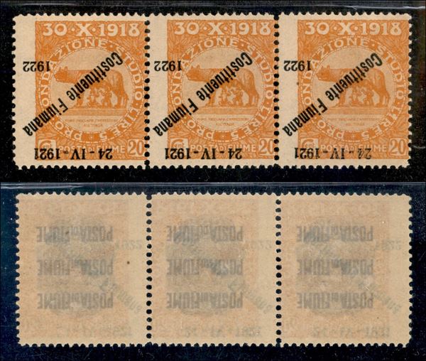 1922 - 25 cent Costituente (182b varietà) - striscia di 3 con soprastampe capovolte e spostate - gomma integra (con falle naturali) - non catalotago