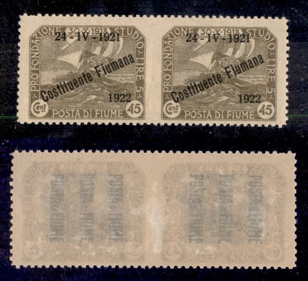 1922 - Costituente Fiumana (183t) - coppia non dentellata al centro - gomma originale (380)
