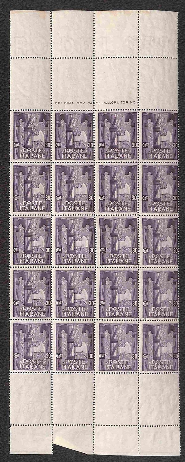 1923 - 30 cent Marcia su Roma (142) - blocco verticale (centrale del foglio) di 20 con bordi laterali e scritta marginale - gomma integra