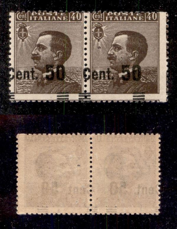 1923 - 50 cent su 40 (139qi + 139 yca) - coppia (di bordo foglio) con C a cavallo e sbarrette in basso - pezzo di destra di formato maggiore - gomma integra