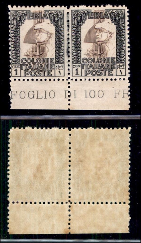 1926 - 1 cent Pittorica (58) - coppia orizzontale bordo foglio - gomma integra - spazio tipografico verticale a cavallo della dentellatura centrale - pezzo destro ottimamente centrato - cert. AG (6.000+)
