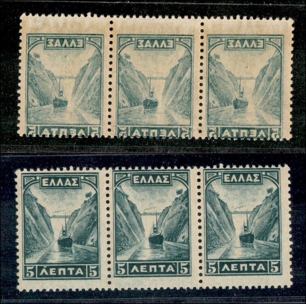 1927 - 5 lepta Canale (304 varietà) - striscia di 3 con decalco - gomma integra