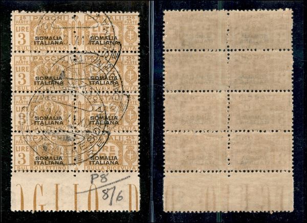 1928 - 3 lire (62) - striscia verticale di 4 bordo foglio usata a Gimma il 9.6.41