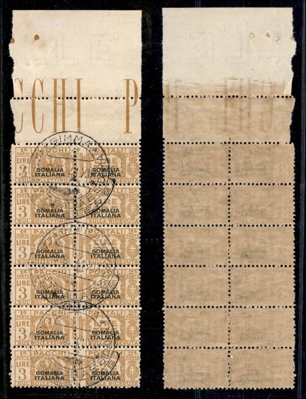 1928 - 3 lire (62) - striscia verticale di 6 bordo foglio usata a Gimma il 9.6.41