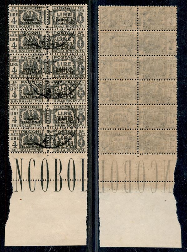 1928 - 4 lire (63) - striscia verticale di 6 bordo foglio usata a Giumma il 9.6.41 - ottima centratura