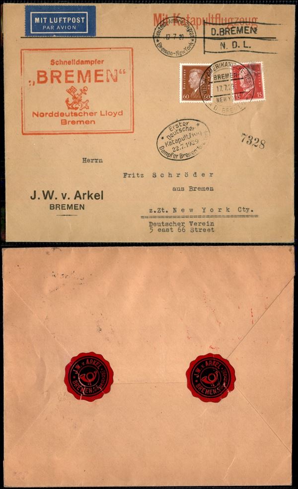1929 (22 luglio) - Katapultflug Damffer Brenen - aerogramma per New York