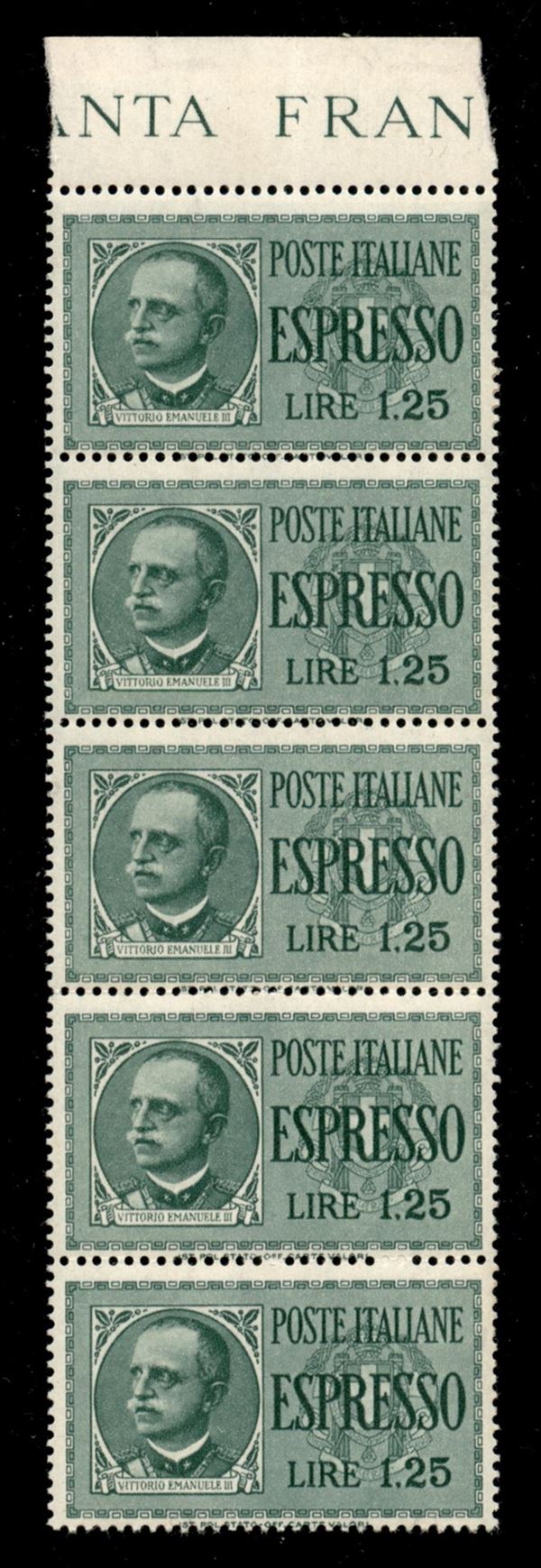 1932 - 1,25 lire (15b) con diciture marginali a cavallo - striscia verticale di 5 bordo foglio - gomma originale (in alto e in basso) integra per i 3 centrali