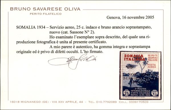 1934 - 25 cent Servizio Aereo Speciale (2) - gomma integra con lieve imperfezione - cert Oliva (6500)