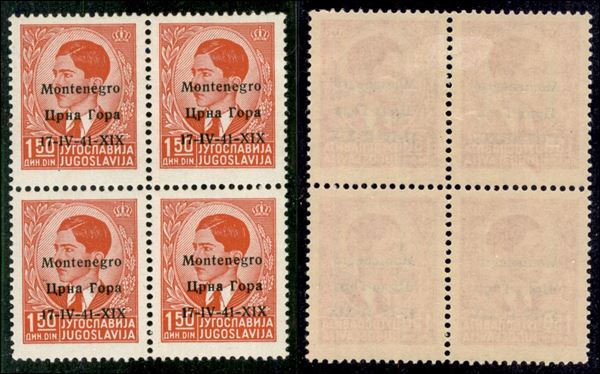 1941 - 1.50 din (3 varietà) - quartina - IV con I bastoncino - coppia superiore gomma originale coppia inferiore gomma integra - non catalogato