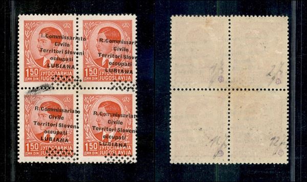1941 - 1,50 din (21d) - quartina con soprastampa obliqua (parziale a sinistra - prima colonna) + R rotta (21w) in alto a sinistra - gomma integra