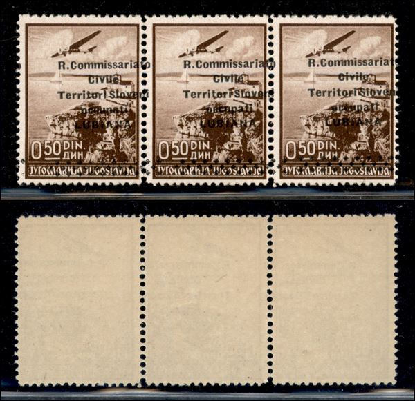 1941 - 50 para (1fca - Aerea) - striscia di 3 con soprastampa spostata a destra (o+i+rombi a sinistra) - gomma integra