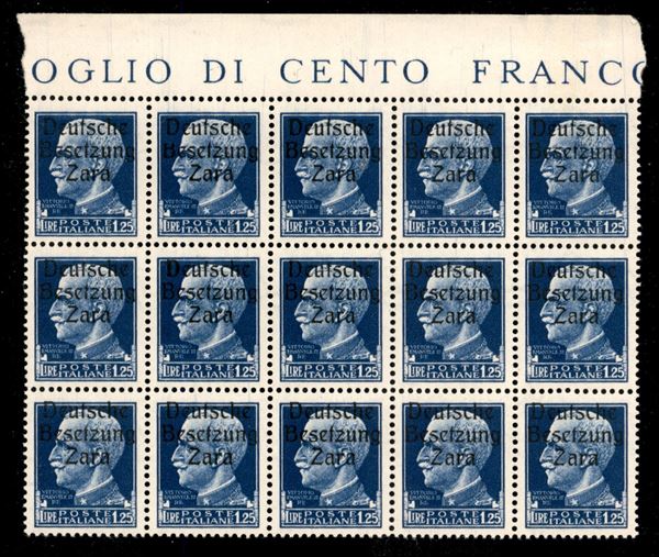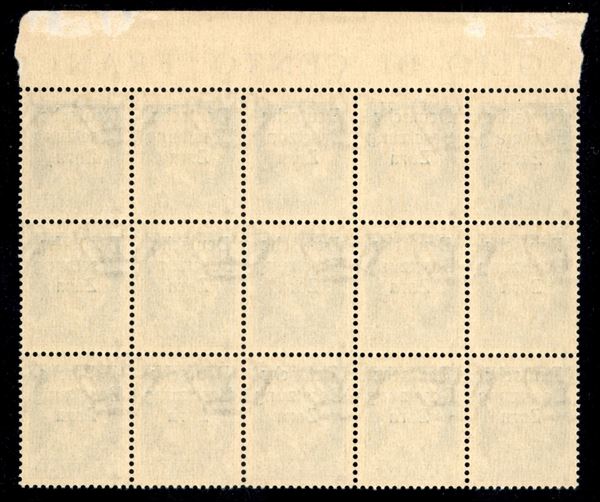 1943 - 1,25 lire (10 varietà) con soprastampa molto spostata in alto (non catalogata) - blocco di 15 bordo foglio (pos. 2/27) con gli errori h (pos. 3) + L (pos. 14) + D grassetto (pos. 13) - gomma integra
