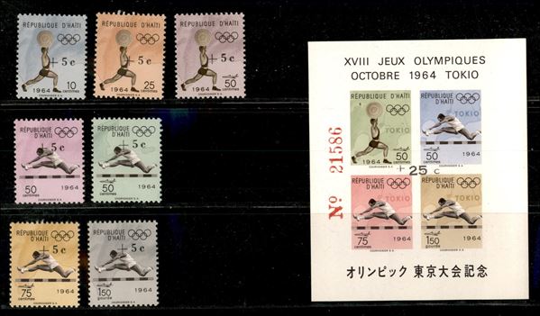 1965 - Olimpiadi Tokio soprastampati (805/811aII + Block 30aII) - emissione completa - senza punto dopo c - gomma integra