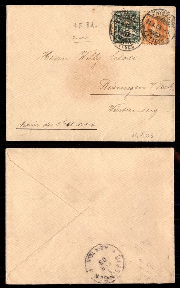 20 cent (58A) + 5 cent (53) - busta da Friburgo a Bissingen (Wuttemberg) del 31.1.03