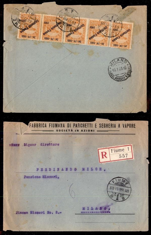 20 cent Costituente (167) - striscia di cinque al retro di raccomandata per Milano del 17.1.23