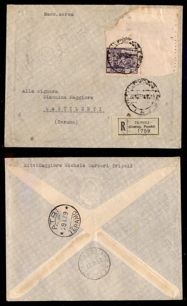 2,55 lire Sibilla (107) angolo integrale di foglio - isolato su raccomandata da Tripoli a Teramo del 26.10.39