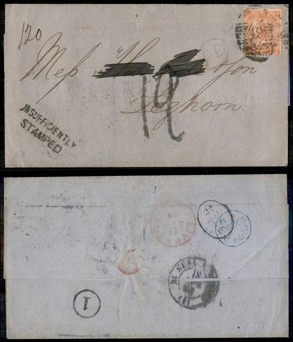 4 pence (24-tav.9) isolato su lettera da Londra a Livorno del 15.4.68 - tassata