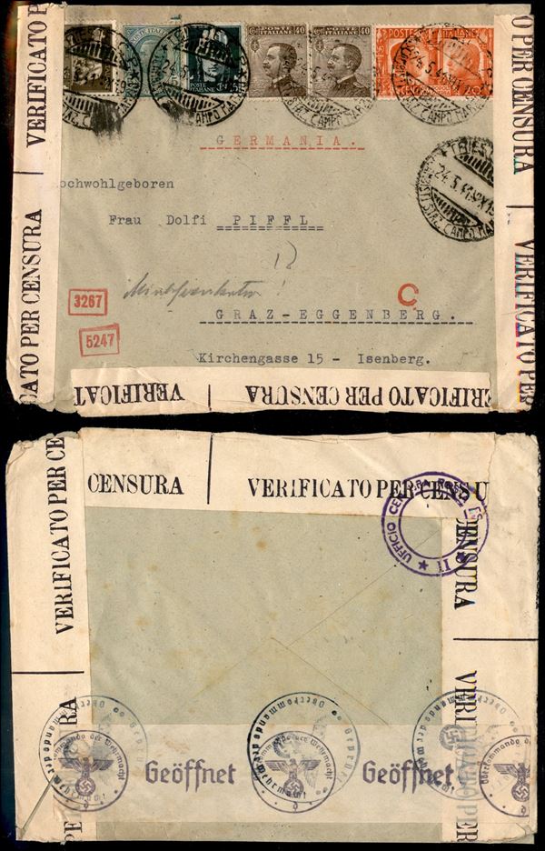 5 cent Leoni (81) + due 40 cent Michetti (84) a validità scaduta + Imperiale (243 + 246) + 20 cent Fratellanza (453) - busta da Trieste a Graz del 24.5.41 - censure