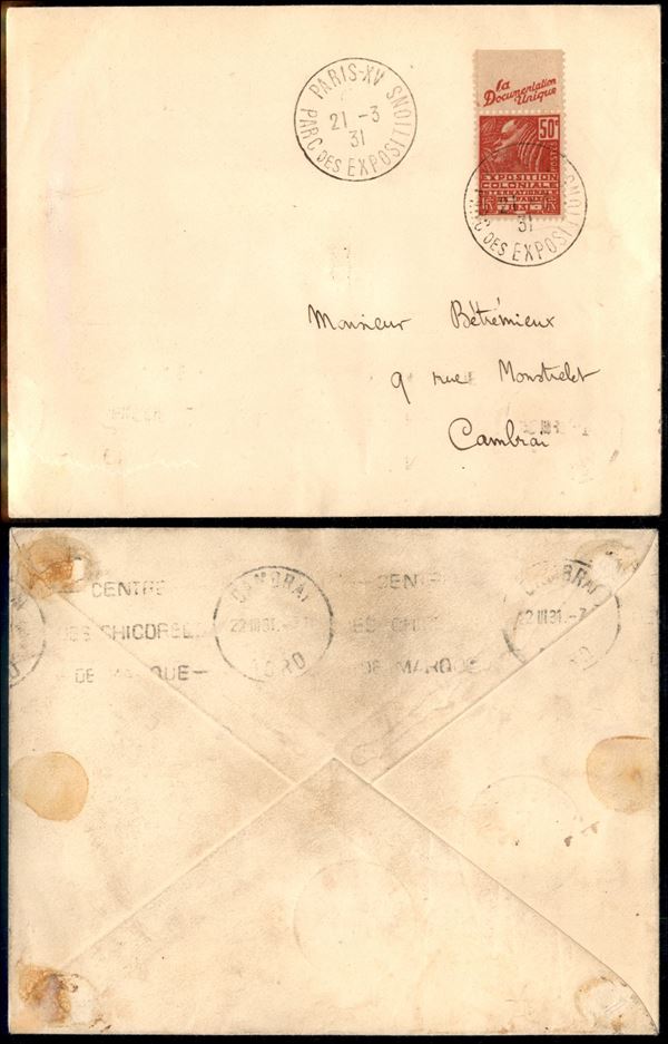 50 cent Esposizione (259) con bandella pubblicitaria - busta da Parigi a Cambrai del 21.3.31