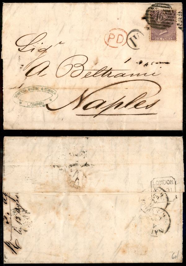 6 pence (25 - tav. 5) su lettera da Londra a Napoli del 31.7.65