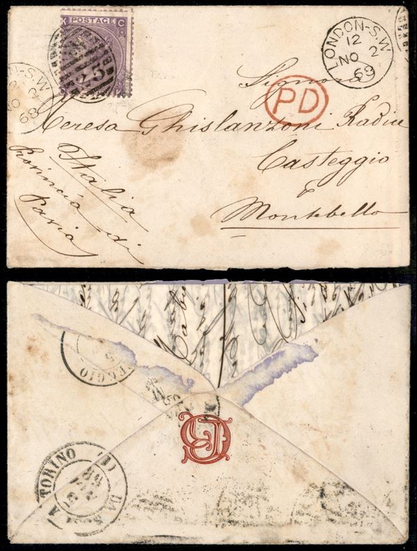6 pence (29 - tav. 6) su bustina da Londra a Montebello del 2.11.68