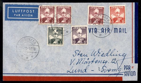 Aerograma affrancato con 1 ore + tre 5 ore + 10 ore + 15 ore (1 + 2 + 4 + 5) Cristiano X da Godthaab per Lund (Svezia)