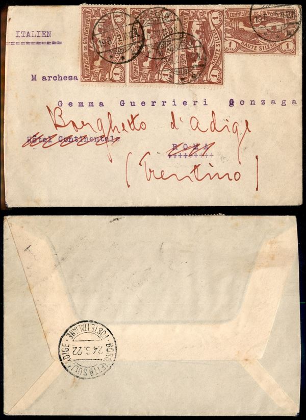 Alta Slesia - Quattro 1 marco (26) su busta da Oppeln a Roma del 19.6.22 inoltrata a Borghetto
