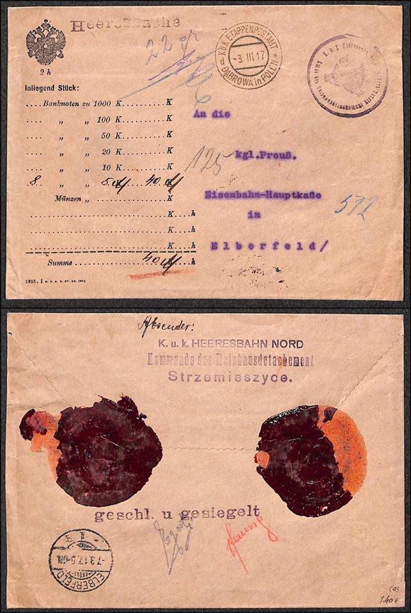 Austria/Ungheria - Posta Militare - Assicurata con denaro da K.K. Etappen Postmat/Dabrowa in Polen a Elberfeld del 3.3.17