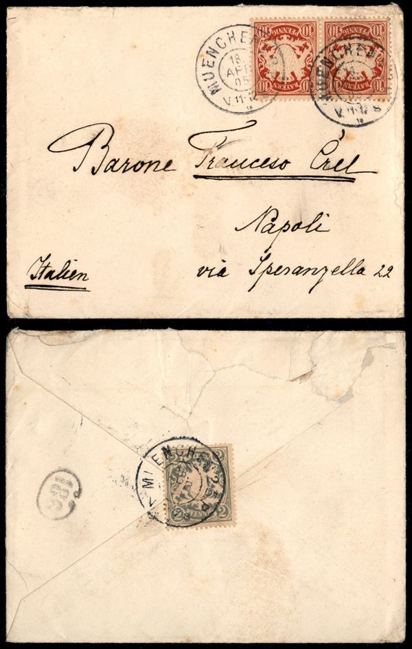 Baviera - Coppia del 10 pfenning + 5 pfenning al retro di lettera da Monaco a Napoli del 18.4.05 (58+63)