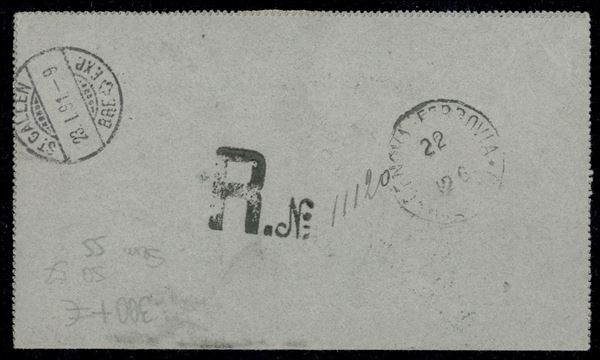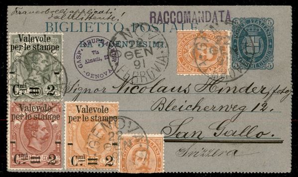 Biglietto postale Stemma da 5 centesimi (B3) raccomandato con affrancatura complementare composta da due 20 cent Umberto I (39 - uno stampato in basso lungo la tratteggiatura) + tre diversi valori Valevole per le Stampe (50 + 52 + 54) da Genova 22 gen 91 per San Gallo (Svizzera)