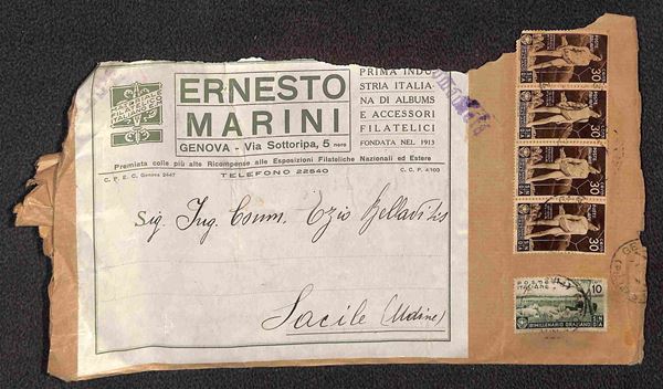 Bimillenario Oraziano - Frammento di grande busta raccomandata "Ernesto Marini" da Genova per Sacile del 14.4.37 affrancata con 10 cent singolo (398) + coppia verticale del 20 cent (399) + striscia orizzontale di 4 del 30 cent (400) + coppia orizzontale del 50 cent (401) + coppia verticale del 75 cent (402) - interessante