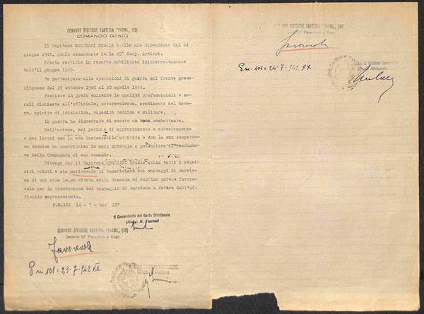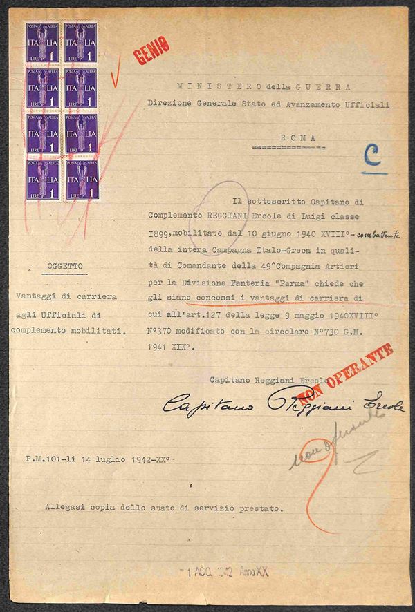 Blocco di otto del 1 lira (14 - Aerea) usato fiscalmente su domanda dalla P.M. 101 del 14.7.42