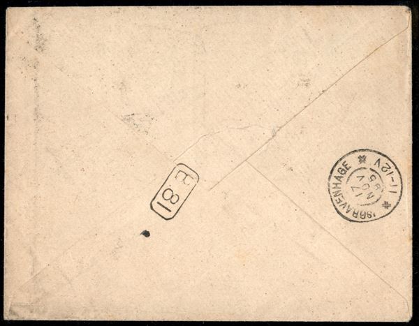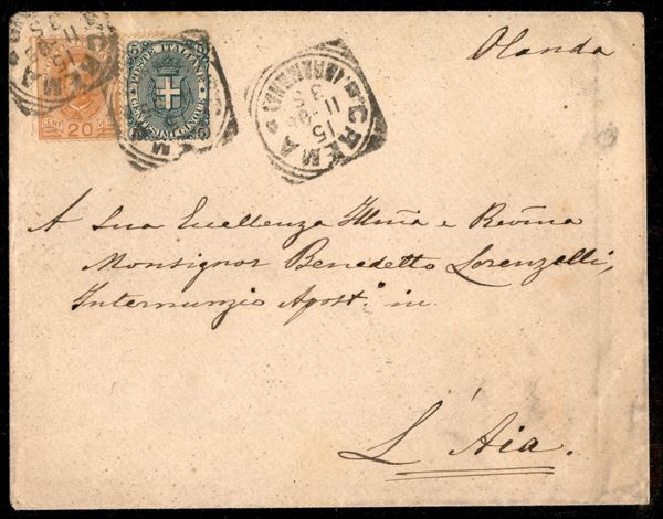 Busta affrancata con 5 cent Stemma (59) + 20 cent Umberto I (61) da Crema 15.11.95 per l'Aia (Olanda) - rara destinazione