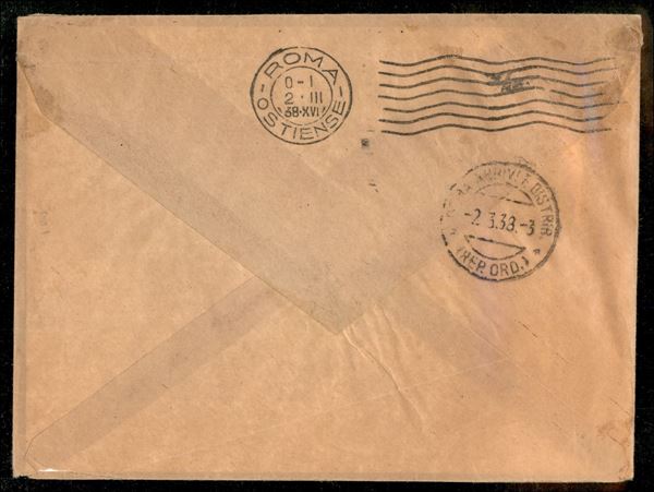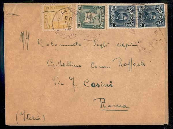 Busta affrancata con due 10 cent Siles (179) + Carte Geografiche Aerea 1 1/2 bolivanons (250 + 252) da La Paz 20 feb. 1938 per Roma - bollo d'arrivo al verso Roma 2 III.38