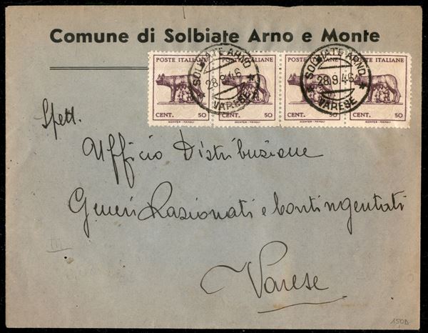 Busta affrancata con striscia di 4 del 50 cent Lupa (515) da Solbiate Arno 28.9.46 per Varese