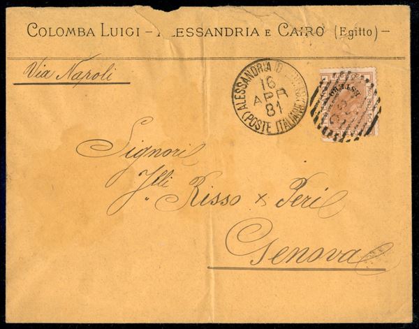 Busta commerciale affrancata con 20 cent (11) da Alessandria d'Egitto 16. apr. 81 per Genova - bollo d'arrivo al verso