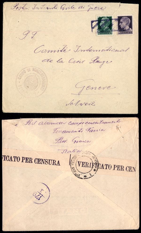 Busta dal Campo di concentramento Ferramonti di Tarsia per la Croce Rossa di Ginevra - 25 cent + 1 lira imperiale (248+252A)