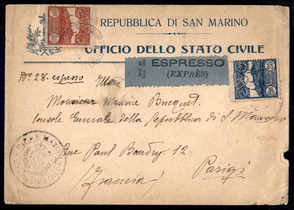 Busta Espresso affrancata con 25 cent + 30 cent Veduta (38 + 39) da S. Marino 22 feb. 17 per Parigi
