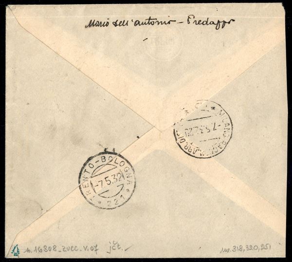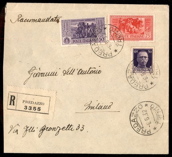 Busta raccomandata affrancata con 50 cent Imperiale (251) + 50 cent + 75 cent Garibaldi (318 + 320) da Predazzo 6.5.32 per Milano - ex coll. Provera