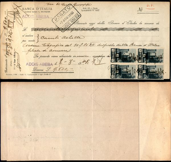 Cambiale da Addis Abeba del 7.8.36 con quartina 1 lira (209 Eritrea) usata fiscalmente