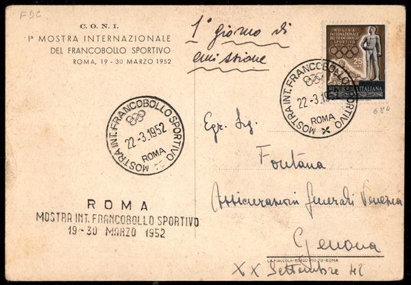 Cartolina illustrata Mostra Internazionale del Francobollo Sportivo affrancata con il 25 lire (684) con annullo della manifestazione FDC