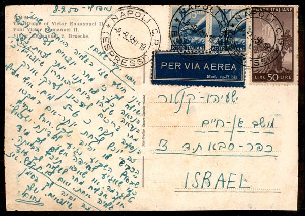 Cartolina paesaggistica affrancata con Democratica coppia del 15 lire (560) + 50 lire (564) da Napoli 8.9.950 via aerea per Israele
